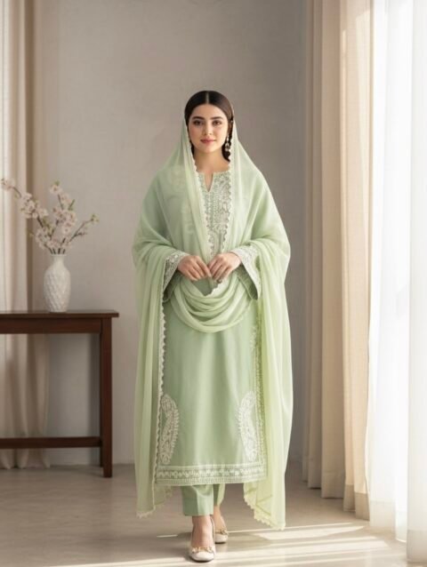 This beautifully crafted stitched 3-piece suit combines comfort, style, and elegance. The embroidered lawn shirt features intricate patterns that add a touch of sophistication, while the matching embroidered lawn dupatta complements the overall look perfectly. The dyed cotton trousers ensure comfort and a flawless fit, making this outfit ideal for casual gatherings, semi-formal events, or festive occasions. Lightweight and breathable, this suit keeps you stylish and comfortable all day long.