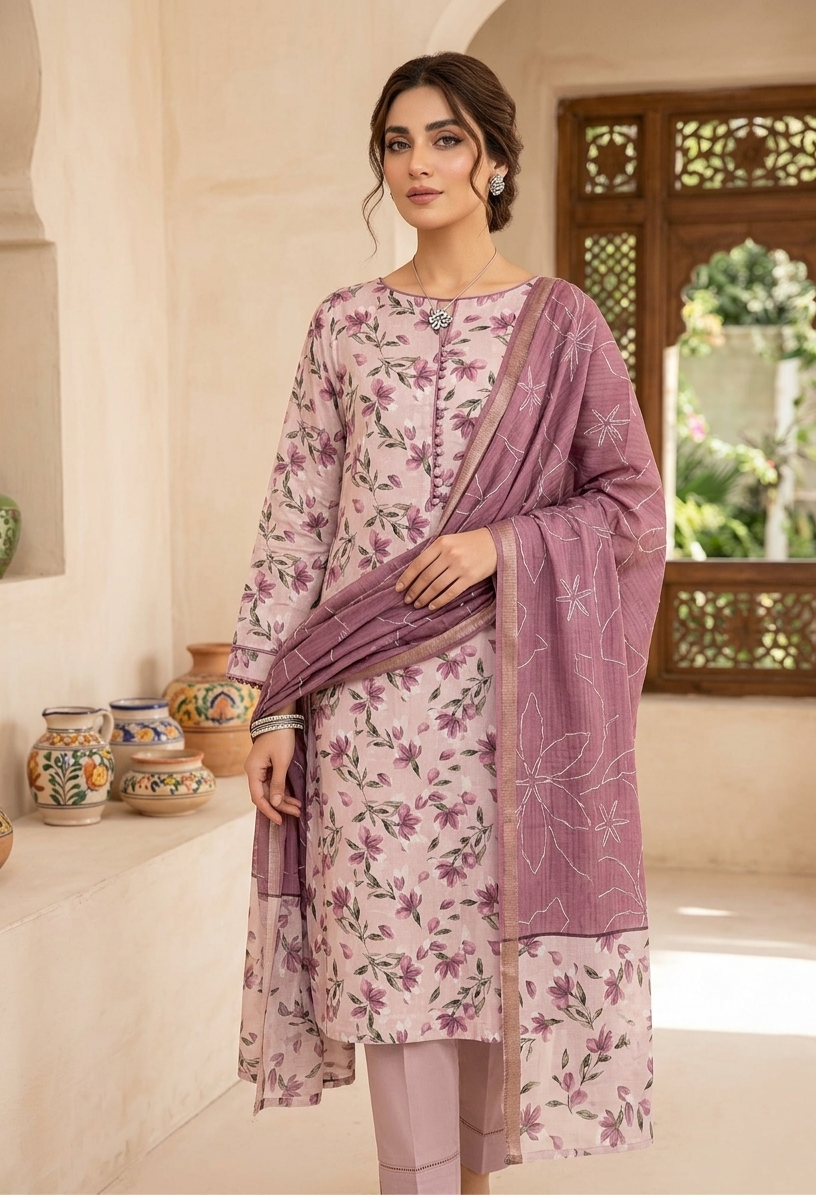Elegant regalia printed shirt paired with a simple plain trouser for a balanced, stylish look.Lightweight voil lawn dupatta adds a soft, breathable touch perfect for summer wear.A comfortable and trendy outfit, ideal for everyday use and casual occasions.