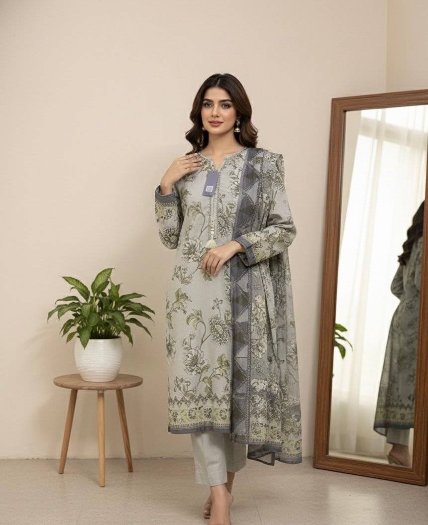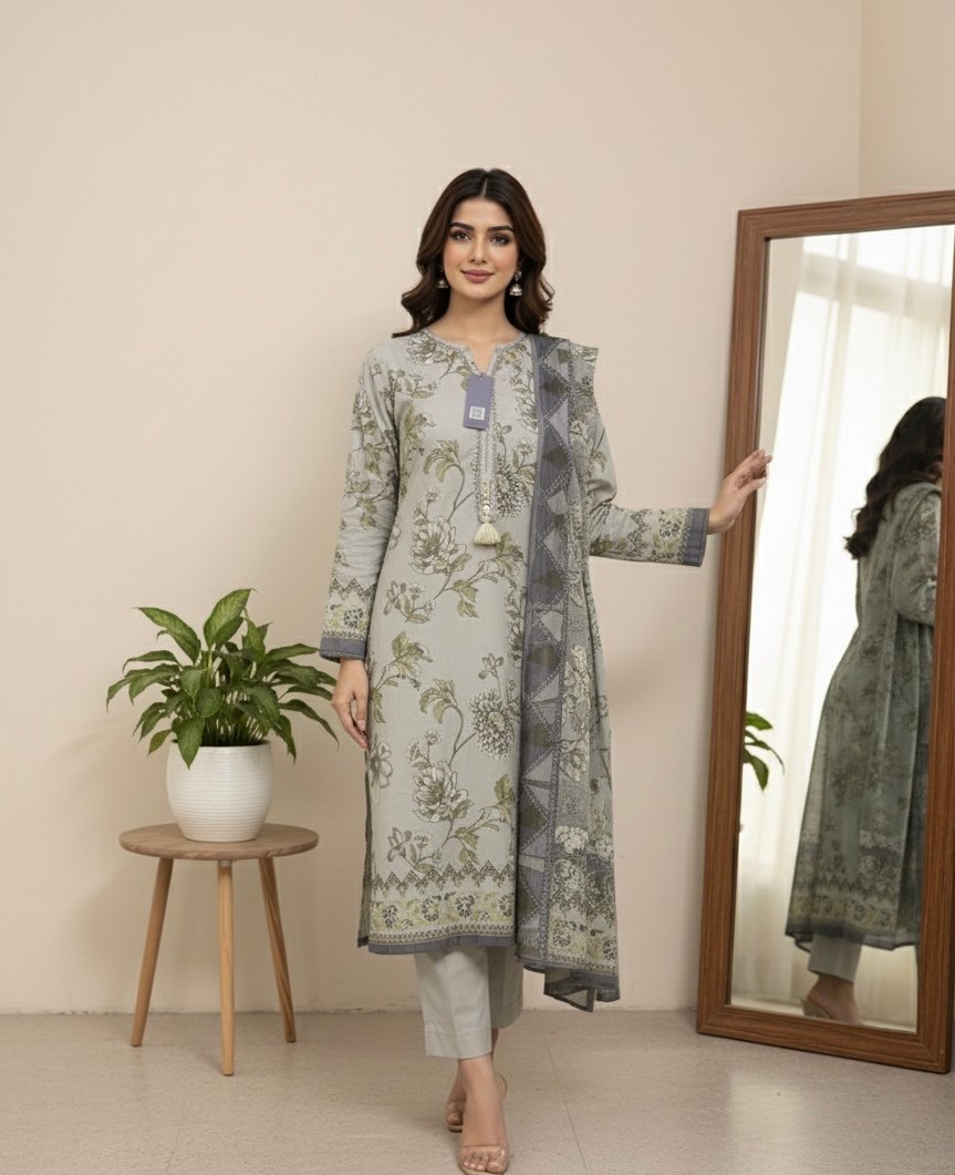This beautifully crafted stitched 3-piece suit combines comfort, style, and elegance. The printed lawn shirt features intricate patterns that add a touch of sophistication, while the matching printed lawn dupatta complements the overall look perfectly. The dyed cotton trousers ensure comfort and a flawless fit, making this outfit ideal for casual gatherings. Lightweight and breathable, this suit keeps you stylish and comfortable all day long.