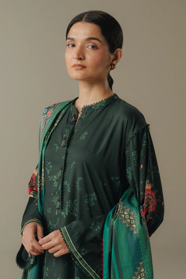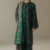 A forest green shirt and trouser set inspired by lush botanical florals, creating a harmonious and nature-inspired look. The ensemble is paired with a teal shawl featuring complementary botanical motifs, adding depth and elegance to this cohesive design.
